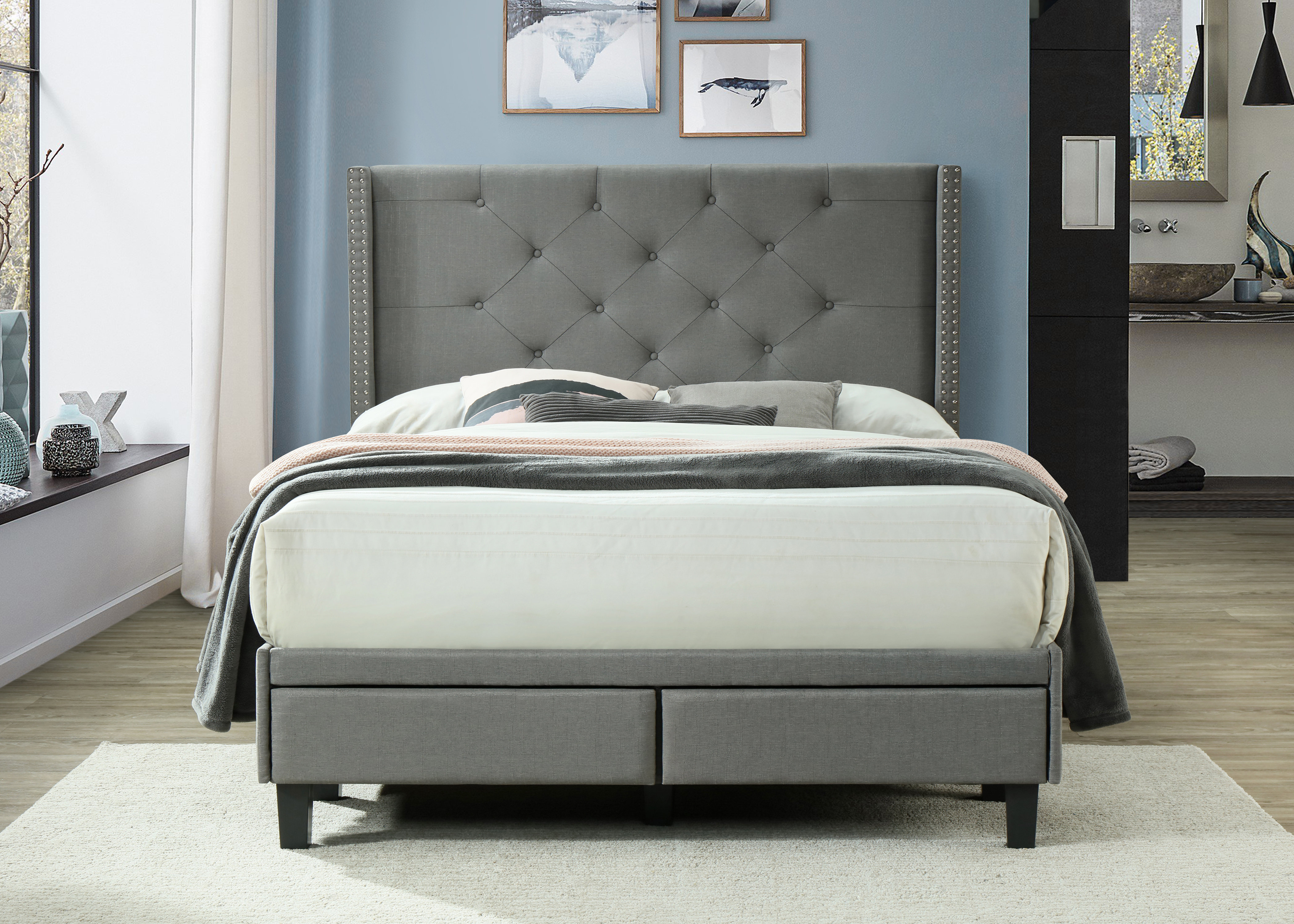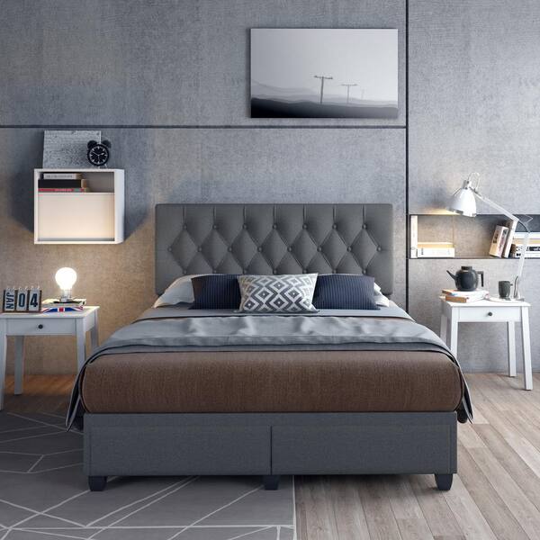Durable storage bed is a convenient option for small bedrooms. Product size 62.5d x 13.5h x 82.5 w; Dg casa kelly panel bed frame with storage drawers and upholstered headboard, queen size in grey linen style fabric. A wide variety of platform storage bed queen options are available to you, such as general use, material, and appearance. Baxton studio brannigan grey fabric brown wood queen storage platform bed the classy home. The dark grey square stitched upholstery adds softness and provides a classic framework for your mattress. There are 610 suppliers who sells platform storage bed queen on alibaba.com, mainly located in asia. Check out our queen bed platform selection for the very best in unique or custom, handmade pieces from our bedroom furniture shops. Bed has two drawers, 13 slats, and four support legs. Memomad bali storage platform bed queen size caramel memomad store. Classic, contemporary design is highlighted with grey lacquer. Fabric wingback upholstered platform bed, queen, grey. Bed sizes available queen size bed.